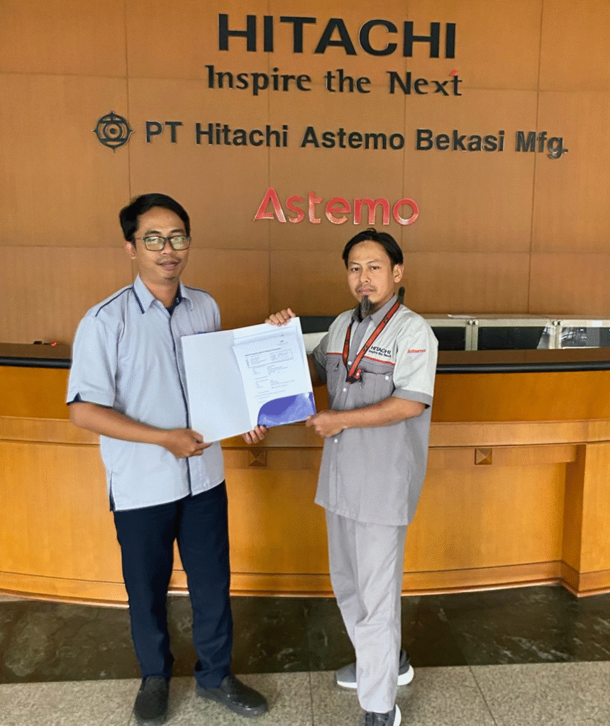 Penyerahan laporan pekerjaan maintenance dan IT support EMSITPRO CEISAHUB antara PT Elwilis Mitra Sejahtera (EMS) yang diwakili Irfan Dwiki (baju biru muda sebelah kiri) dengan PT Astemo yang diwakili oleh Bpk Sunardi (baju abu-abu sebelah kanan) di Hitachi Astemo Head Office pada Senin, 5 Mei 2025.